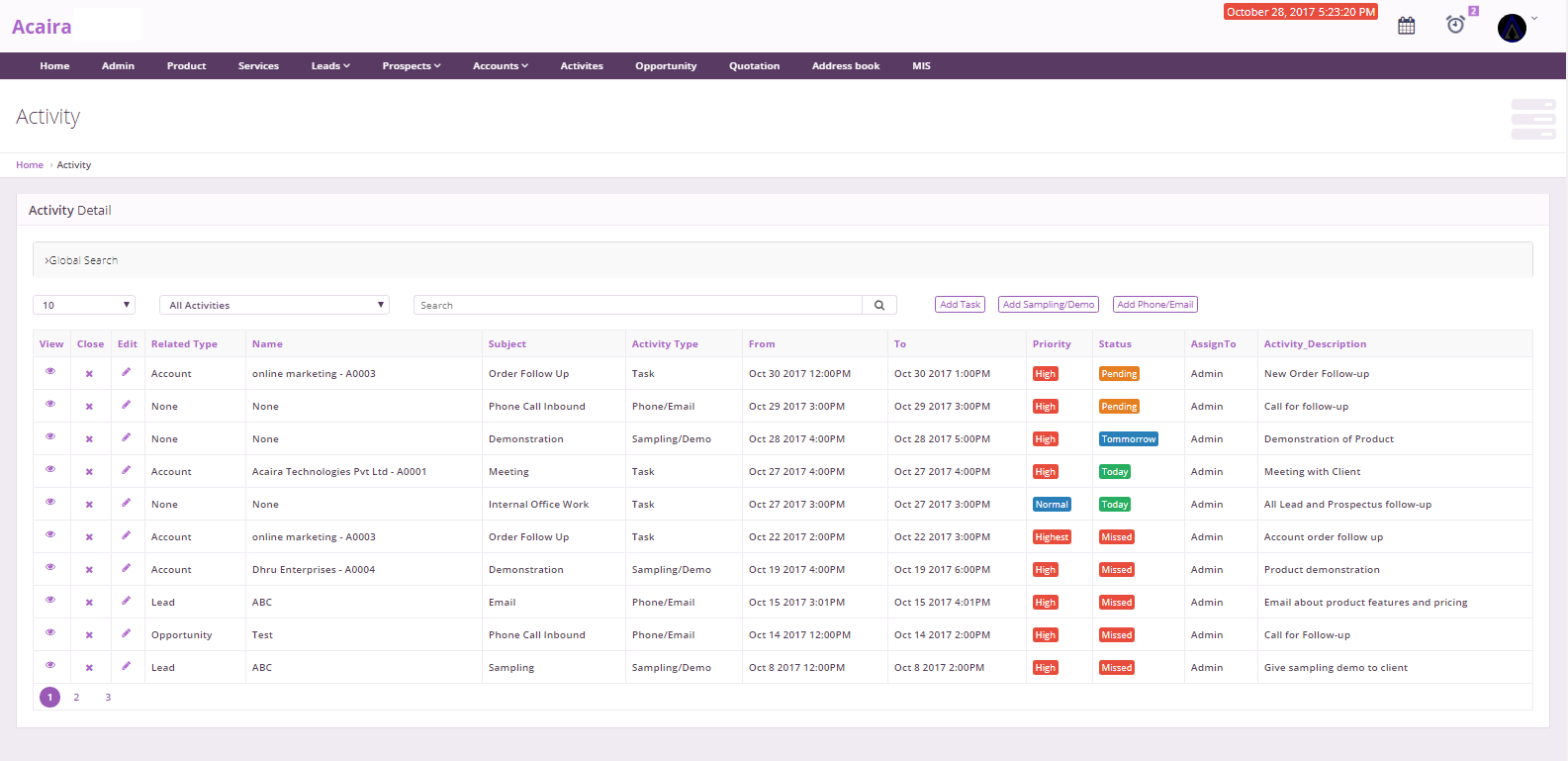 Activities Management enables you to create and view all your tasks and events in a single place. Users can update activity progress, track team progress, set reminders, and assign tasks as well.