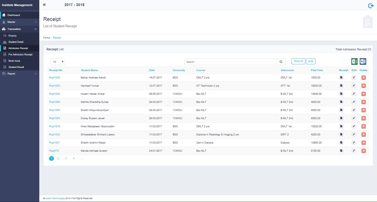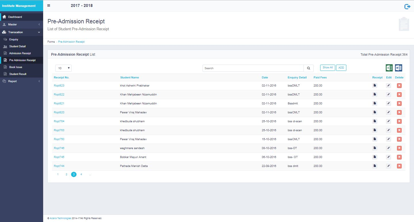 Receipt Management organises admission receipt and pre-admission receipt. Admission Receipt is created when the fees paid while taking admission in the university.