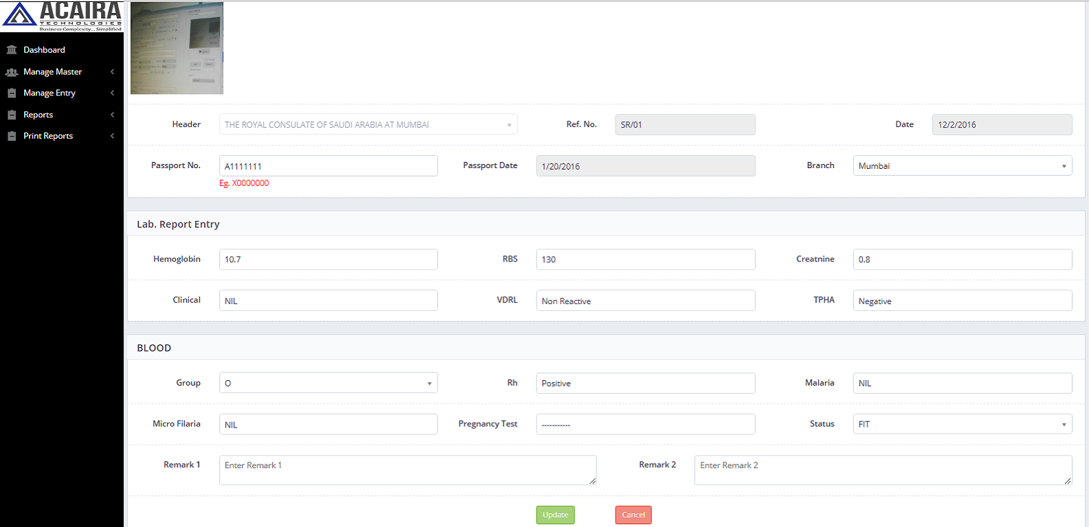 Once the candidate is registered from the reception user it comes to its first stage of Lab test. All the test is done in the lab and the result is being updated by the users. Under Lab Management you can handle multiple candidates' test reports quickly.