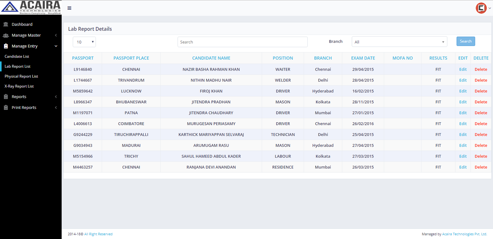 Get a listing of Lab Report and find a Candidate by using the text search filter. Then select the Candidate to view, edit or delete their lab details.