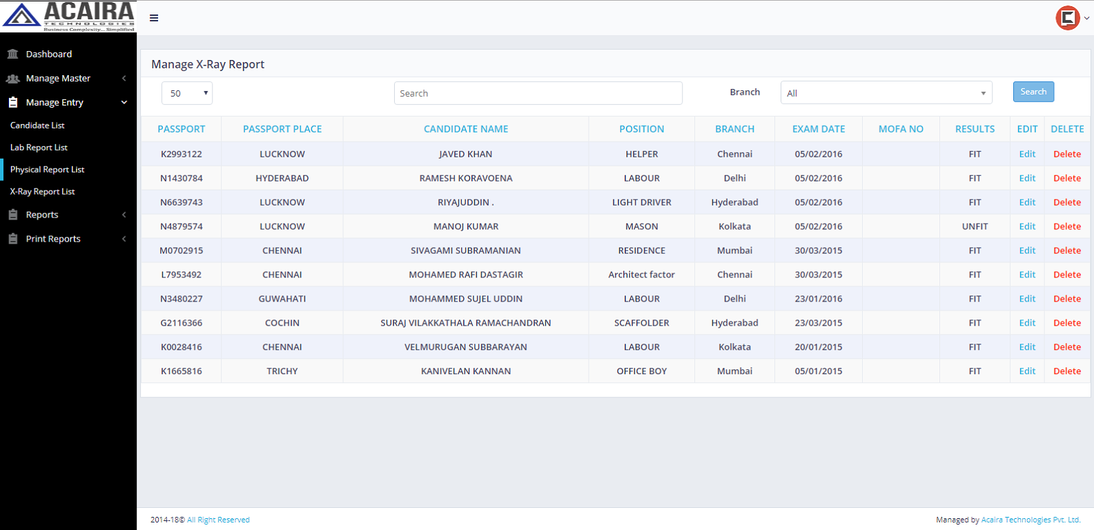 Get a listing of X-Ray Report and find a Candidate by using the text search filter. Then select the Candidate to view, edit or delete their x-ray details.