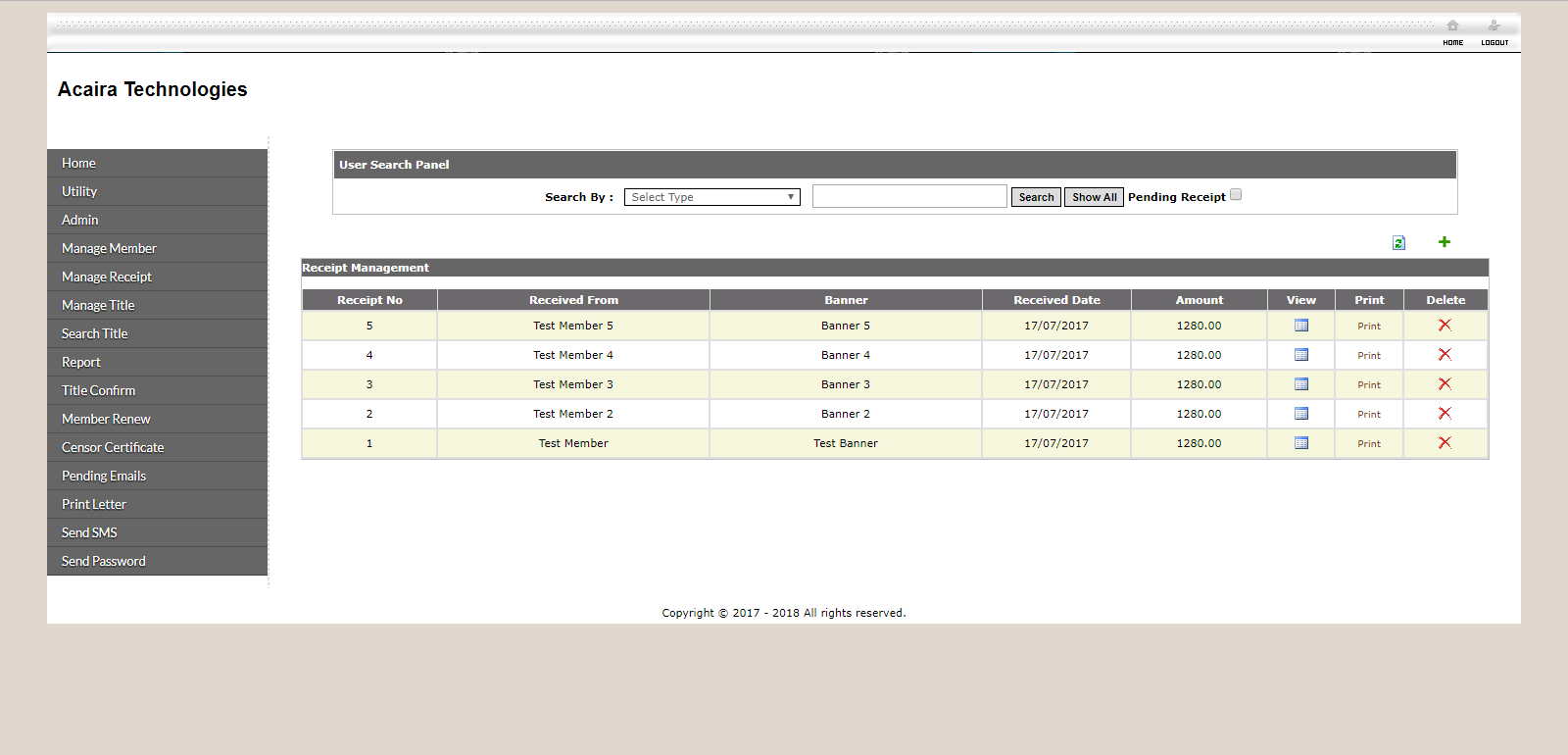 Receipt Listing provides receipt information where you can manage your receipt data or search your receipt by multiple search type. Also you can view your receipt, and print it if you want to hand it to your member.