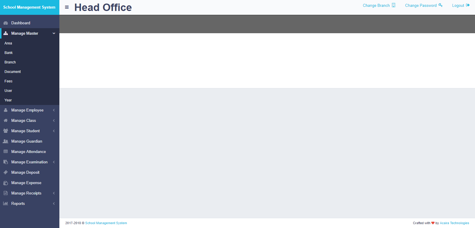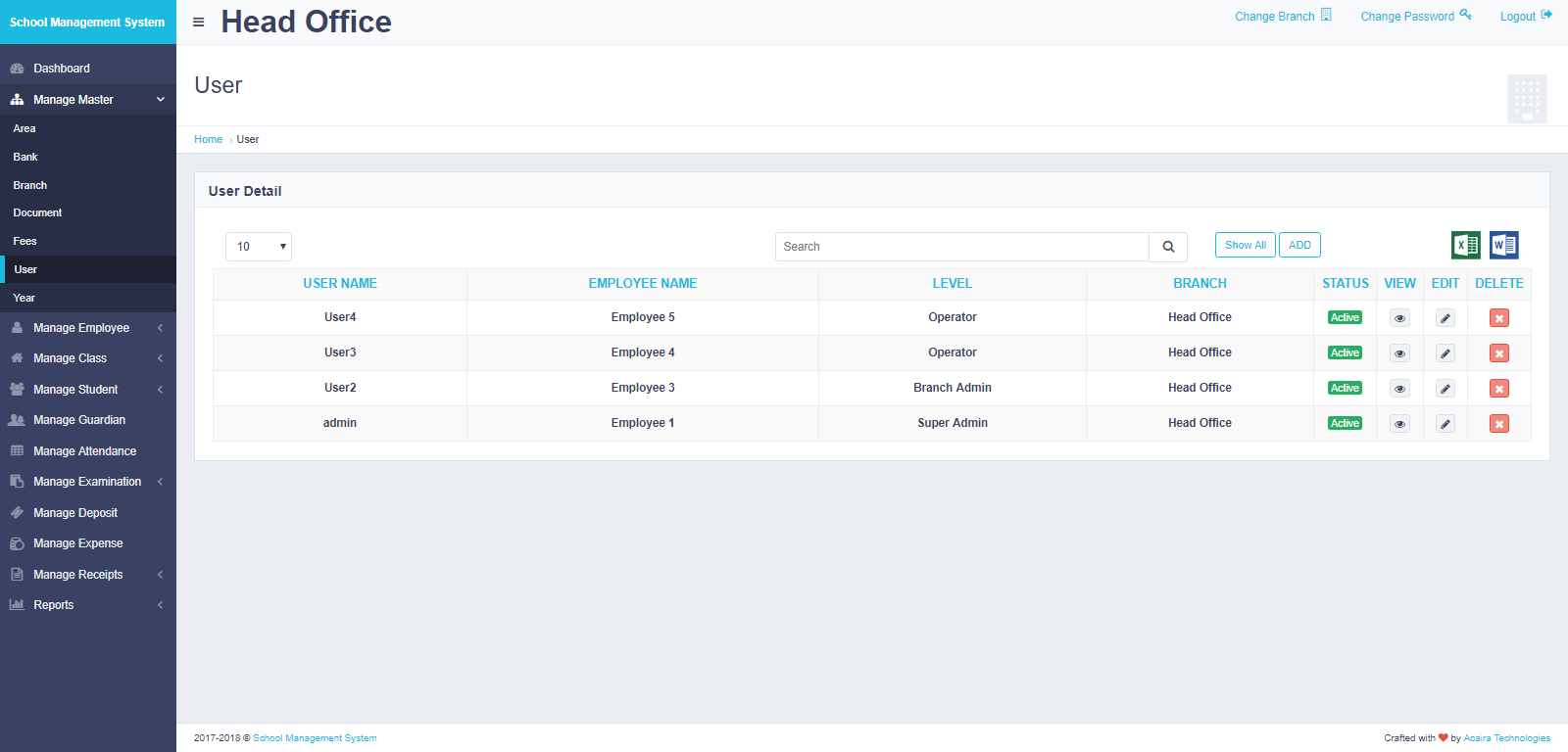 A flexible data model that enable users to make master of Branch, Fees, User etc. Master Management is used to expedite storage of data while up-to-date the complexity of administrative and management tasks.