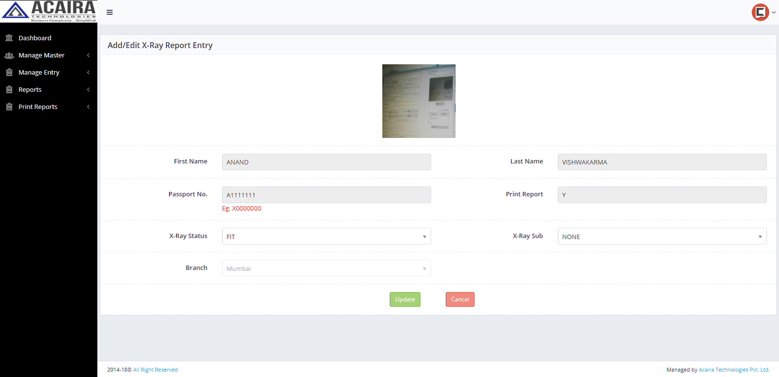 Our third and the last stage is the X-Ray test. Alike the Lab and the Physical test, the X-Ray test is also being updated by the users once done. Allows the user to subsequently update the X-Ray reports.