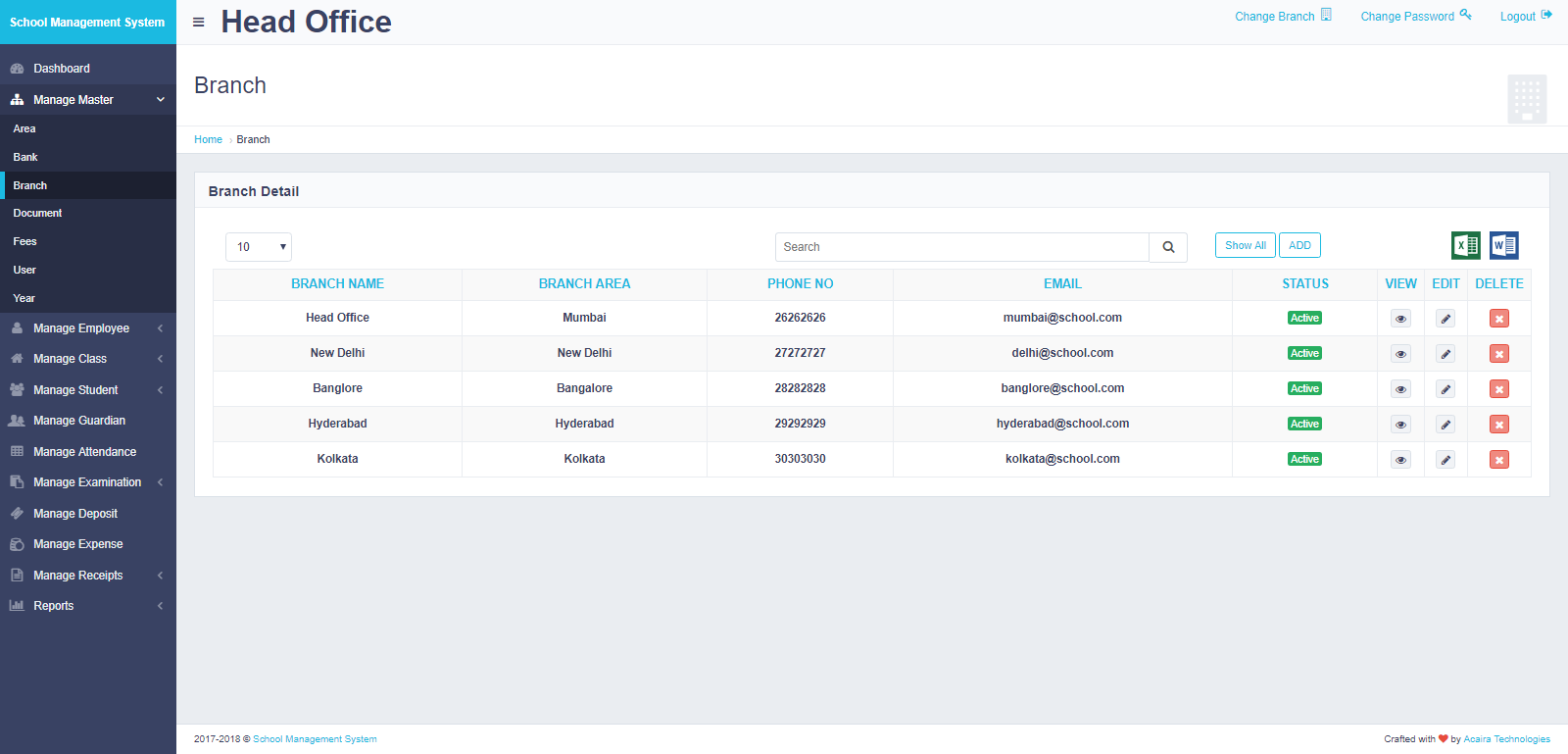 Branch management lets you have control on all the school under your main branch. With our Branch Management you will be able to get all kinds of reports relating to all the branches at various locations.